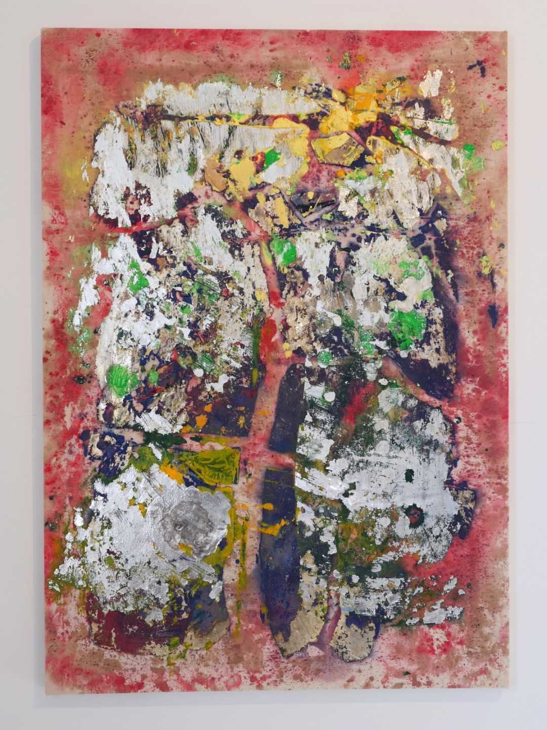 Edgar Arceneaux. Skinning the Mirror (Fall 2), 2025. Acrylic paint, silver nitrate, glass on canvas. 44 x 31 x 1 in.