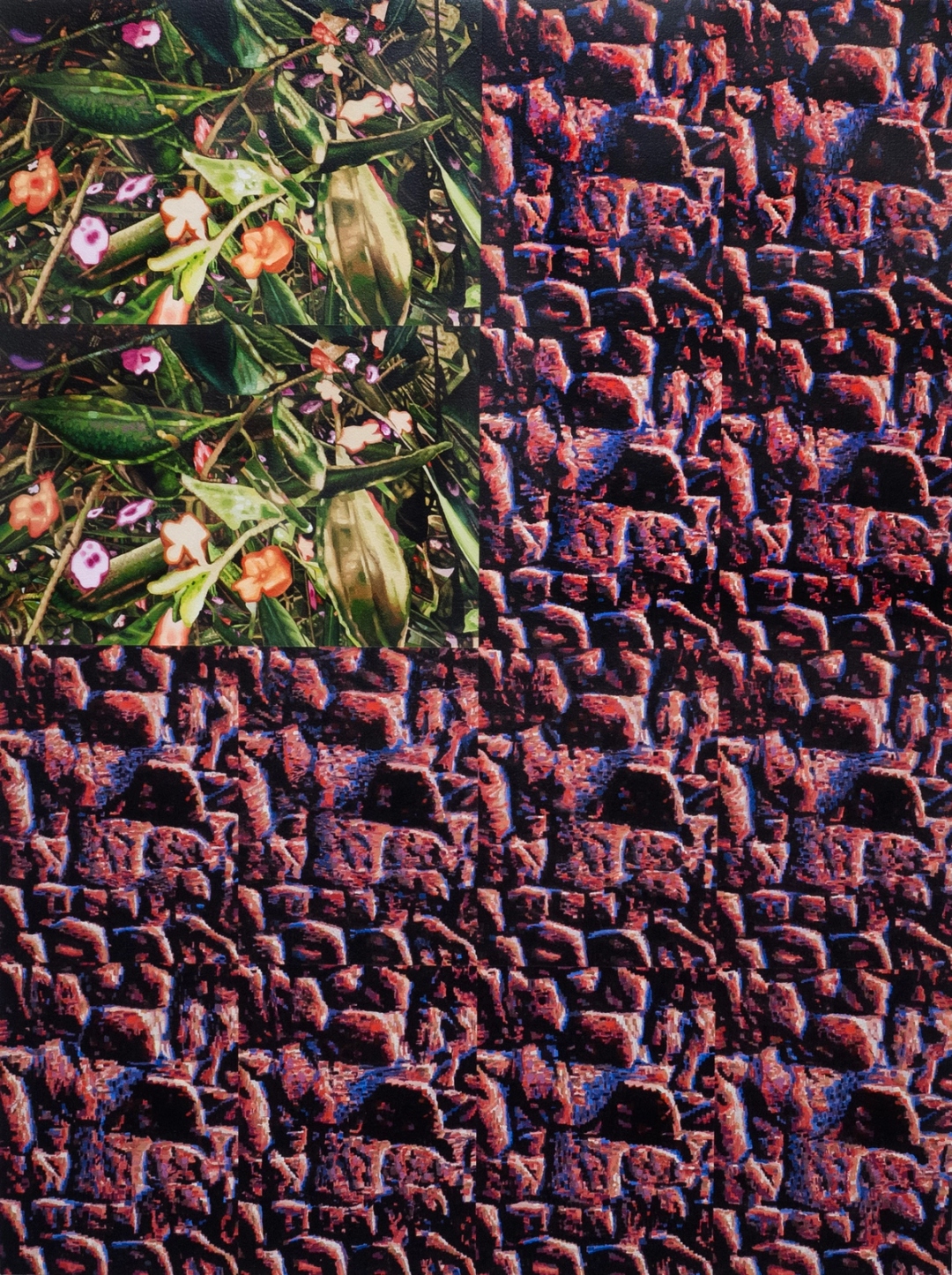 Mathew Zefeldt. Flowers, Foliage/Facade, Sunset, 2024. Acrylic on canvas over panel. 48 x 36 in.