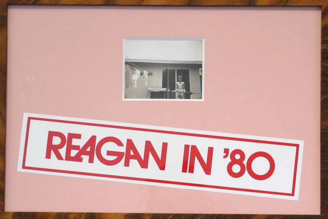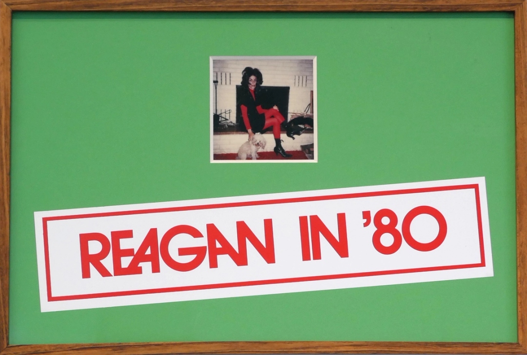 Lee Noble. Bedtime for Bonzo, 2025. Found polaroid, bumper sticker, artist's frame. 10 x 15 in.
