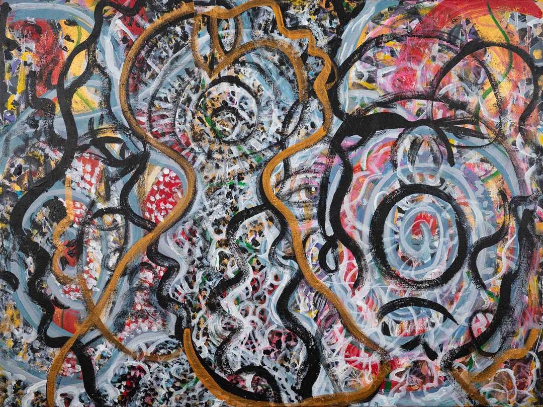A vessel for the collective memory of his community, Aiken begins each painting with intuitive freeform underpaintings that he terms Spirit Writing. Rhythmic and sinuous, his line doubles back on itself in the infinite manner of a Mobius strip, nesting one body or visage inside another. Drawn from the artist’s ancestors, these gestures form the grounds of his work and suggest shared history, community, and experience.