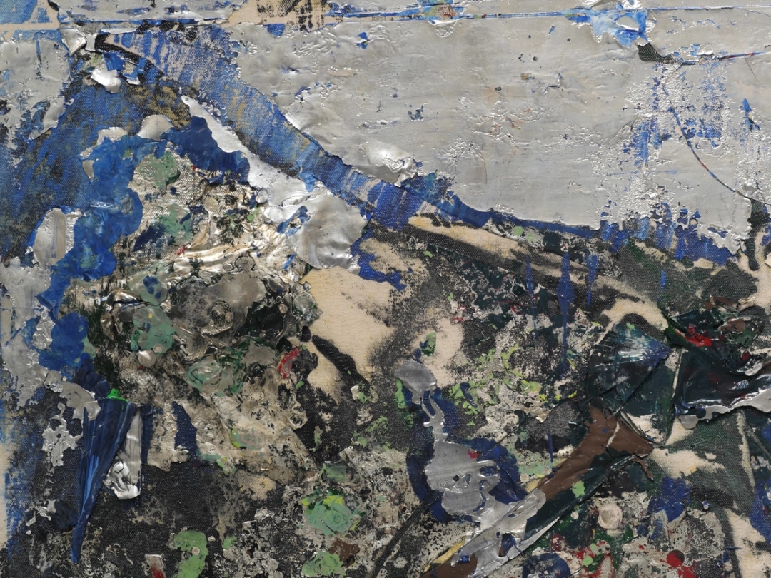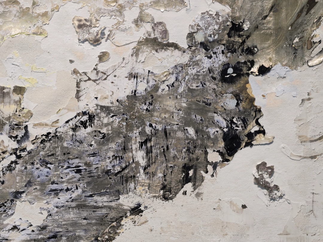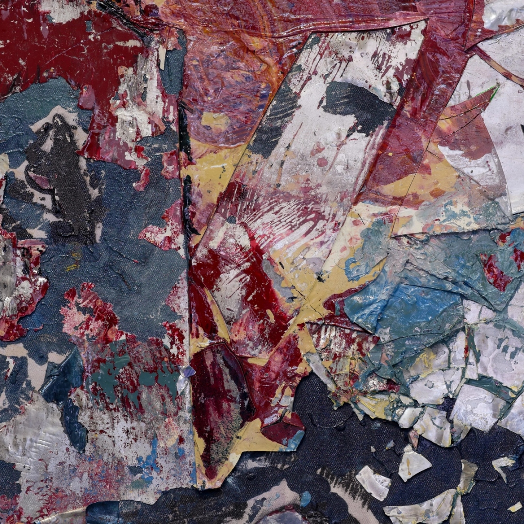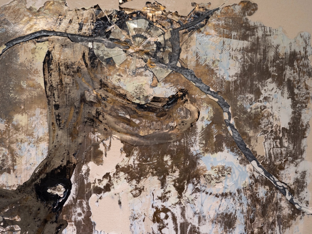 Edgar Arceneaux, Skinning the Mirror (Summer 1), 2025 (detail). Acrylic paint, silver nitrate, glass on canvas. 80 x 120 x 3 in.