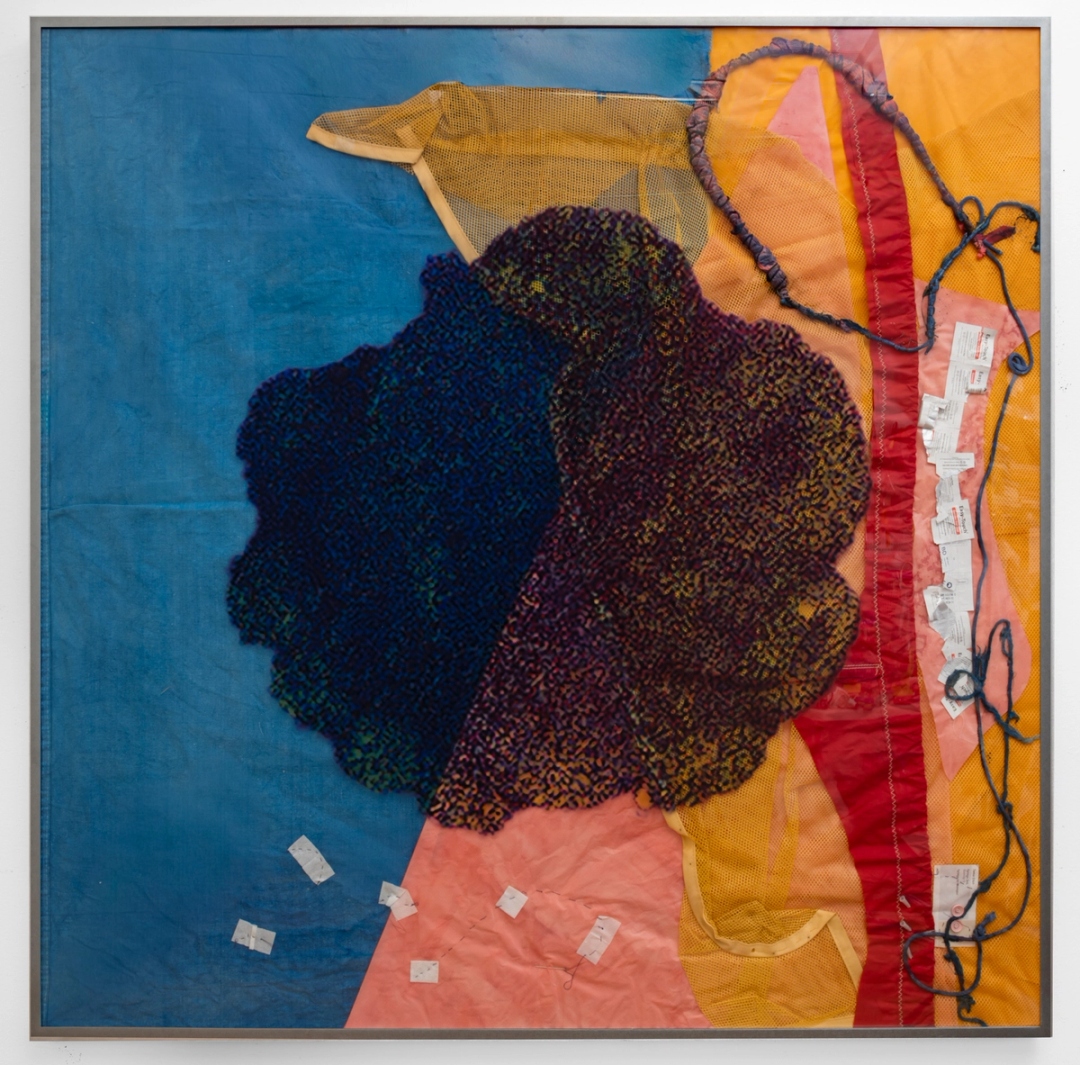Tamar Ettun. Embryo Collage 2, 2025. UV print on plexiglass, hand-dyed fabric, sails, gauze pads, syringe wrappers, sewing pins, thread, aluminum frame. 49 x 49 in.