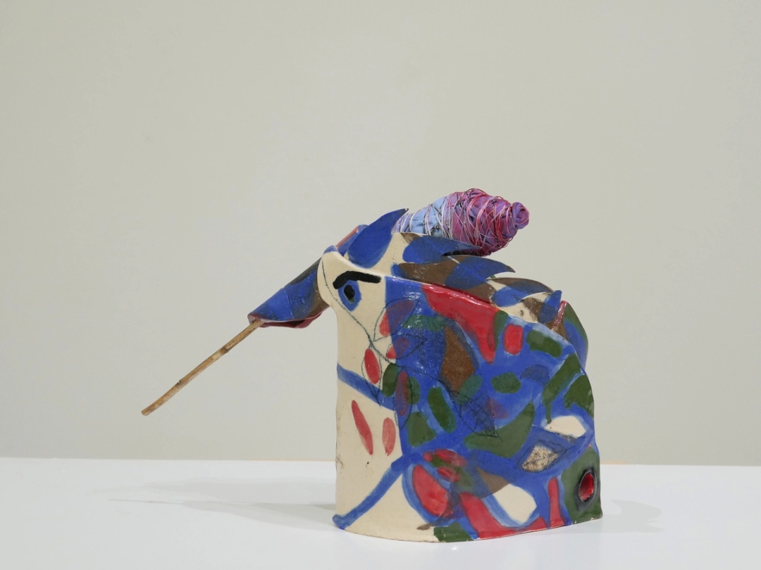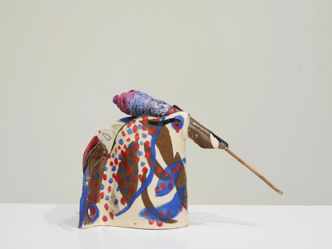Tamar Ettun. Blue Trap With an Attitude, 2020-2025. Ceramic, glaze, underglaze, oil stick, fabric, shibori fabric dye, thread, stick. 11 x 10¾ x 4¼ in.