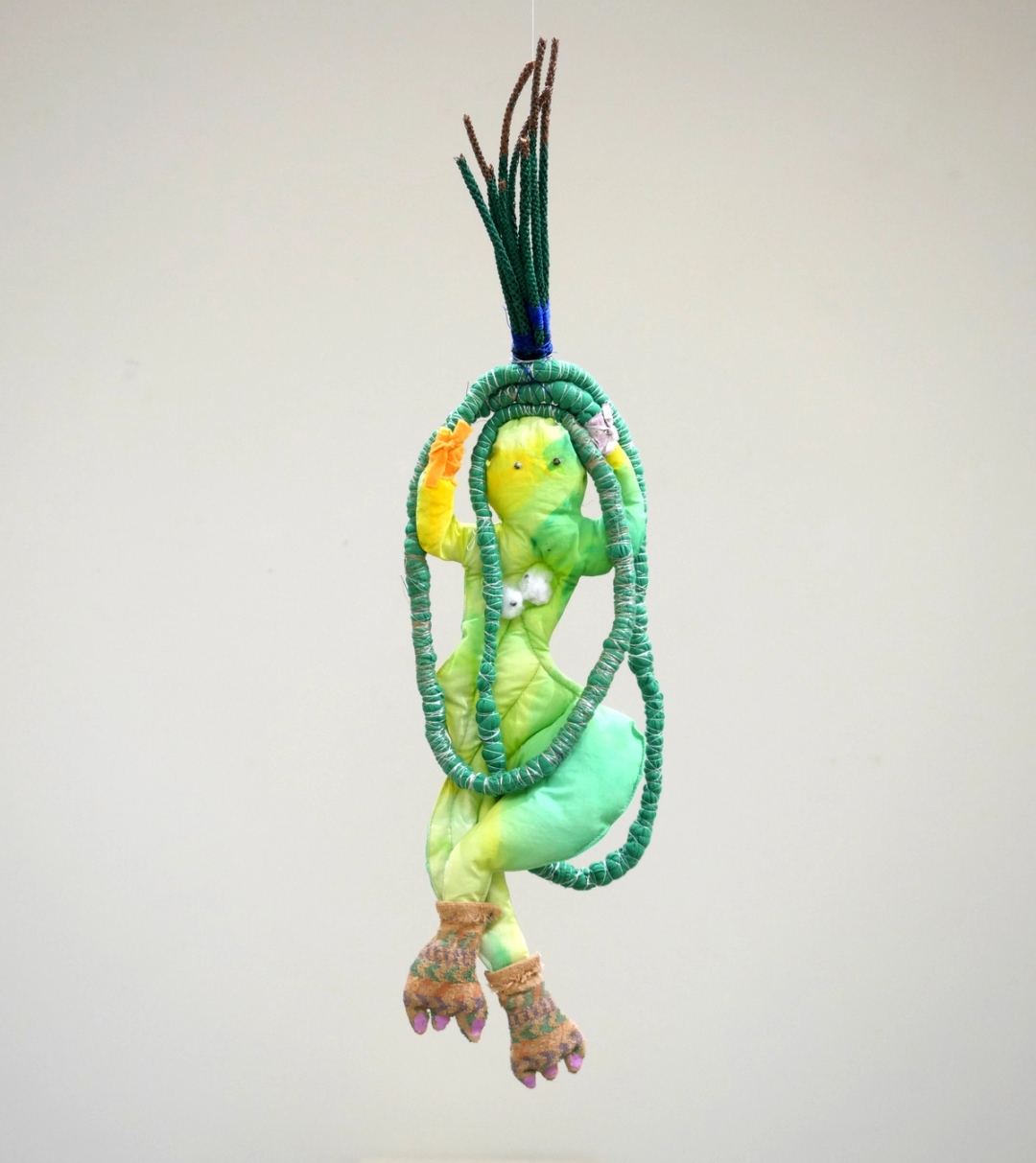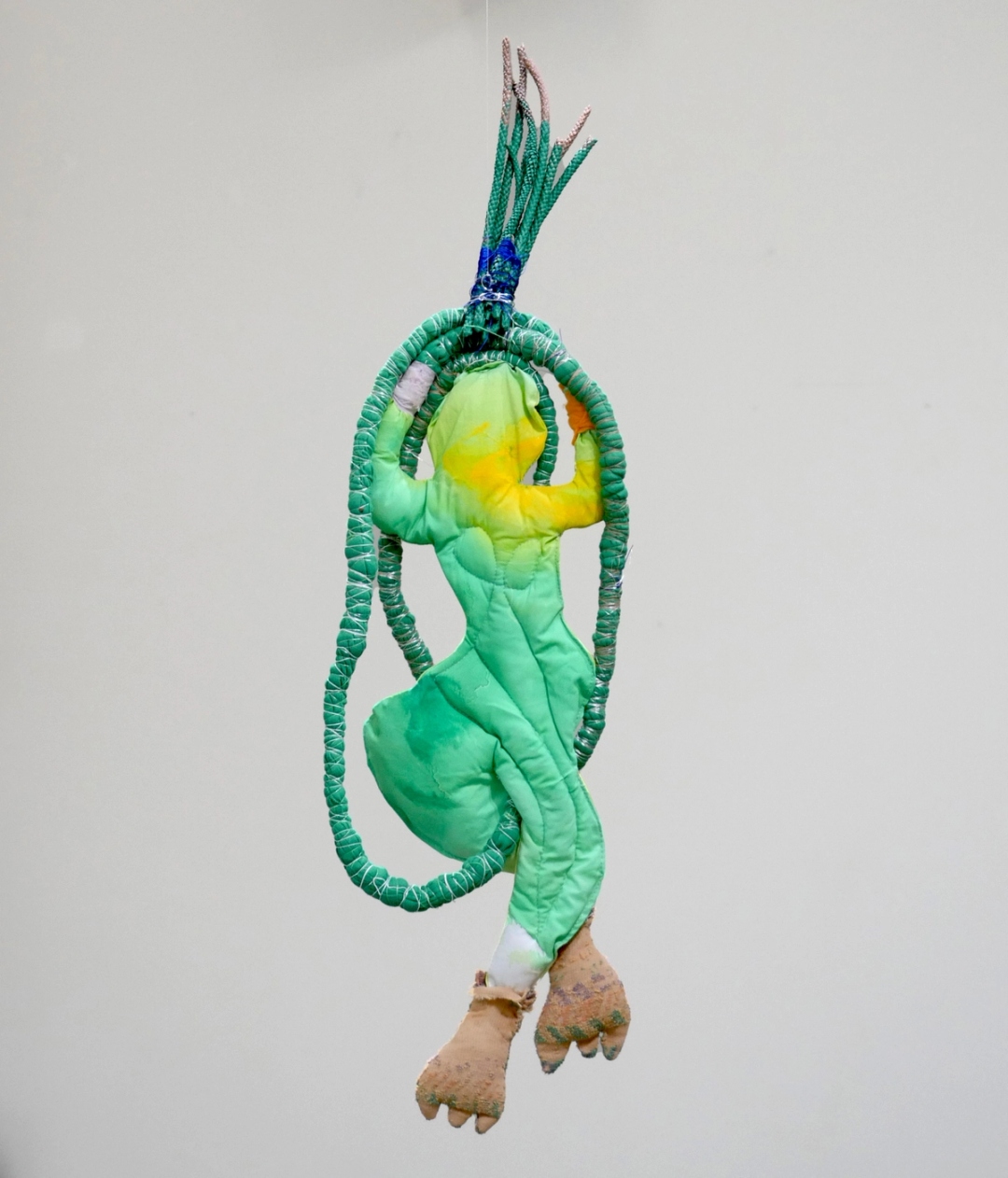 Tamar Ettun. The Demon of Entanglement, 2024. Hand dyed linen and silk, metal wire, branches. 34 x 9 1½ in.