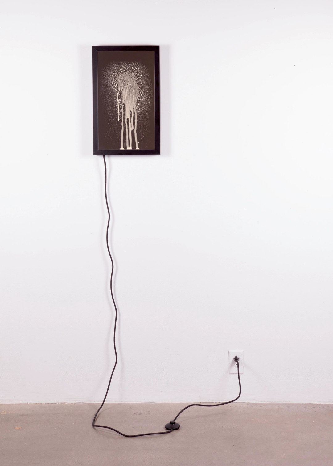Smaller wall reliefs inspired by bathroom design trends hone in on the industry’s core paradox: the desire for a frictionless, clean, and glamorous space in an environment designed to accommodate the smudged, unruly realities of our corporeal needs. This paradox is further explored in the artist’s video works. Presented on custom displays resembling medicine cabinets, Harris-Babou co-opted the technology of smart workout mirrors to layer the viewer’s reflection with videos of foamy substances that recall oozing, dripping expectorate or expelled breastmilk.