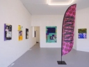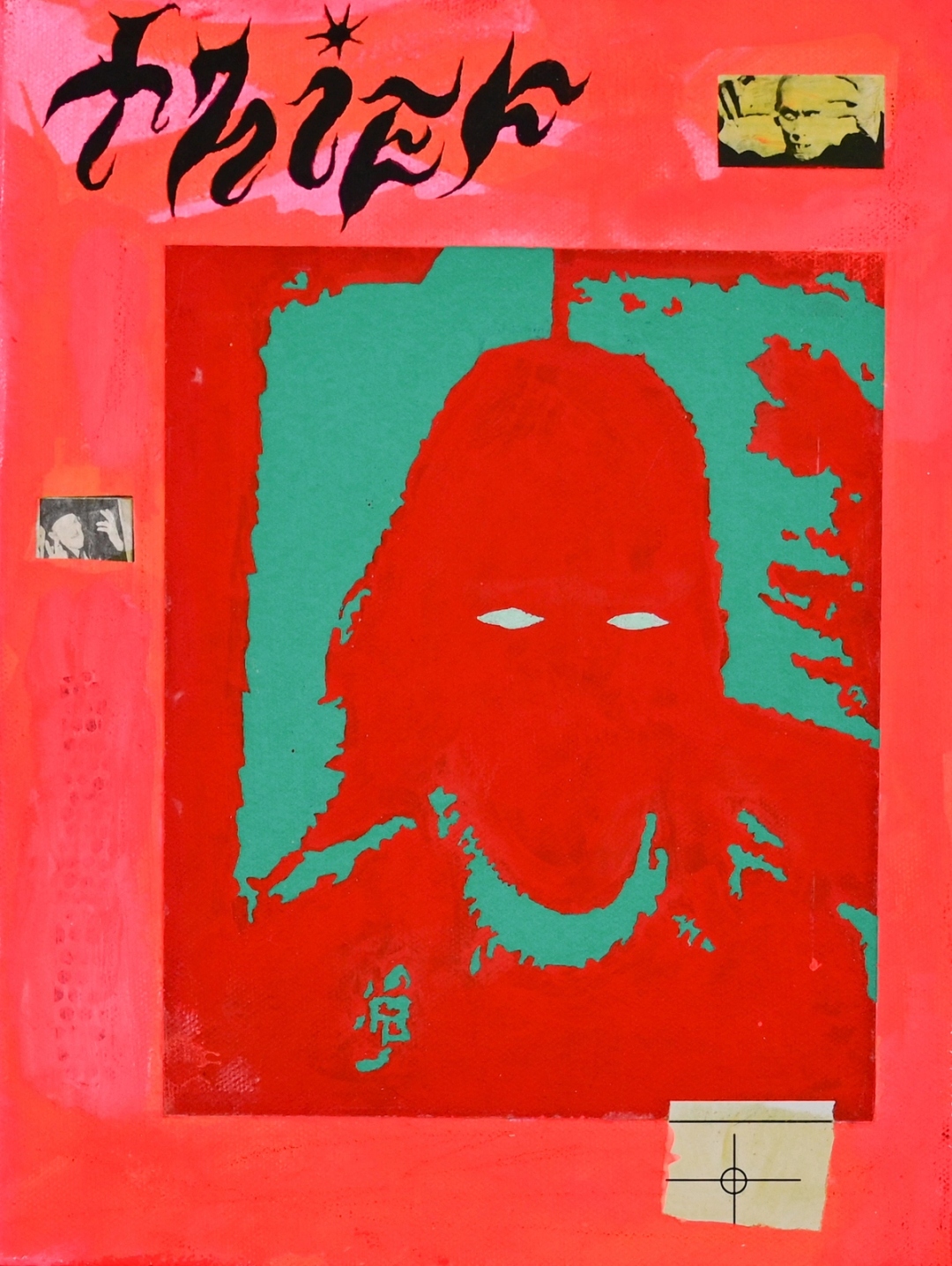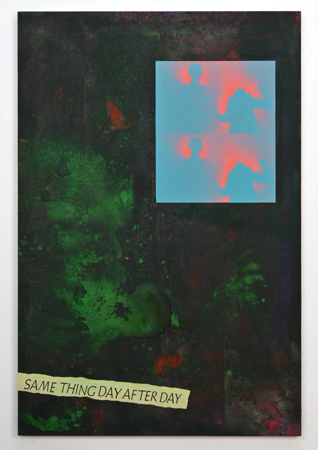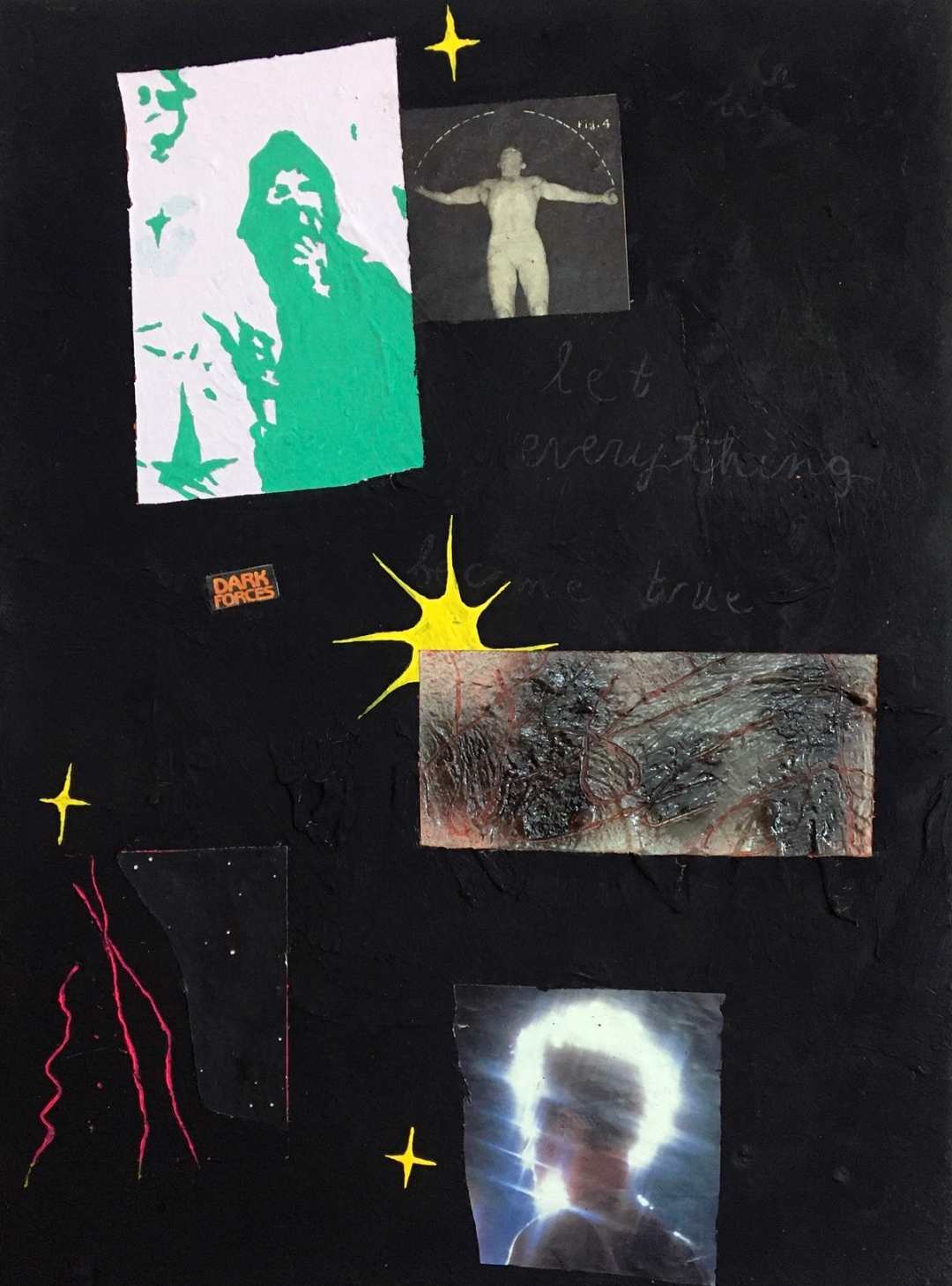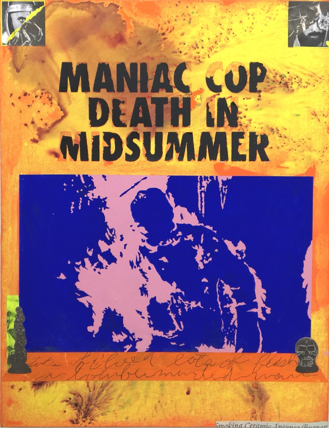 Lee Noble is an artist and musician who works in painting, sound, video, and installation. Influenced by film history, punk culture, camp, and science fiction, his recent collaged paintings explore the psychology of American fear.