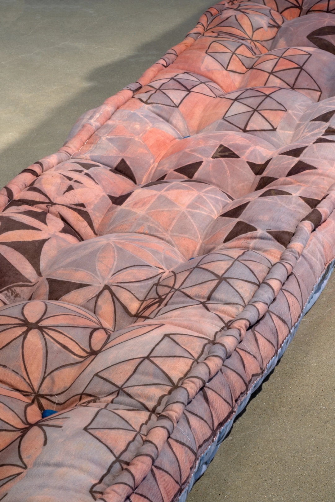 Rotem Tamir. Jerayah (No. 2), 2024 [detail]. Hand-carved woodblock print on organic cotton twill; soda ash, Synthrapol, myrobalan, calcium hydroxide, gum arabic, aluminum acetate, kaolin clay, ferrous sulfate, pomegranate powder, indigo powder, rose madder; tufting twine, nylon thread, and locally sourced wool. 9 x 31 x 147 in.