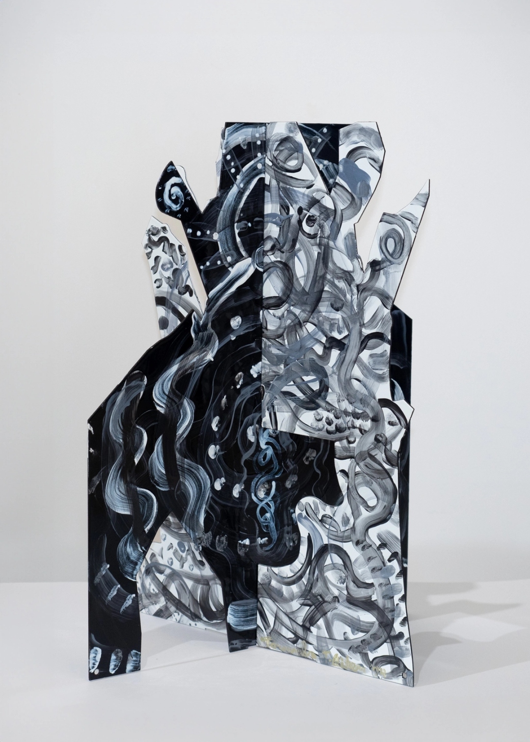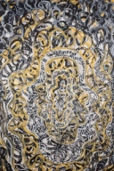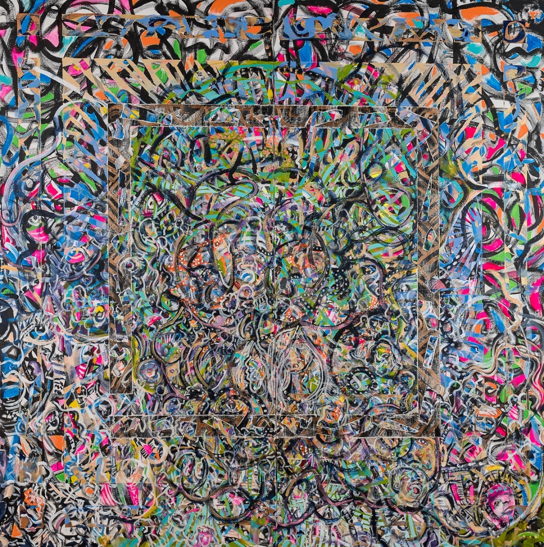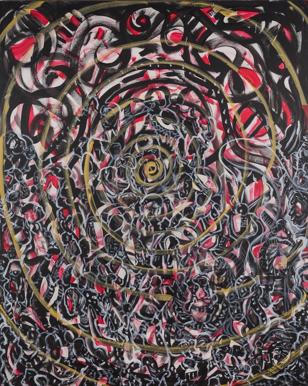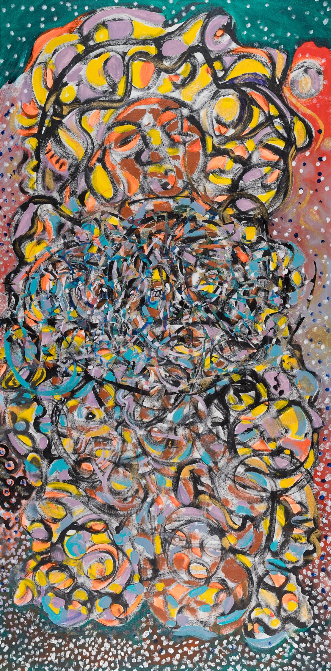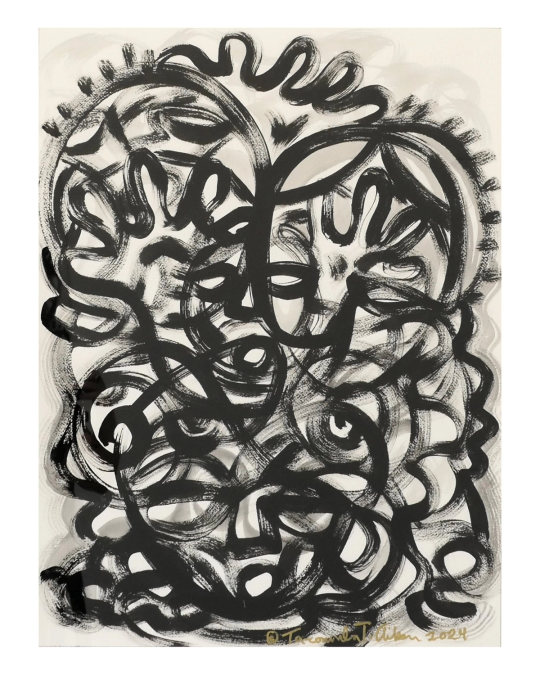 A vessel for the collective memory of his community, Aiken begins each painting with intuitive freeform underpaintings that he terms Spirit Writing. Drawn from the artist’s ancestors, these gestures form the grounds of his work and suggest shared history, community, and experience. Rhythmic and sinuous, Aiken's line doubles back on itself in the infinite manner of a Mobius strip, nesting one body or visage inside another.