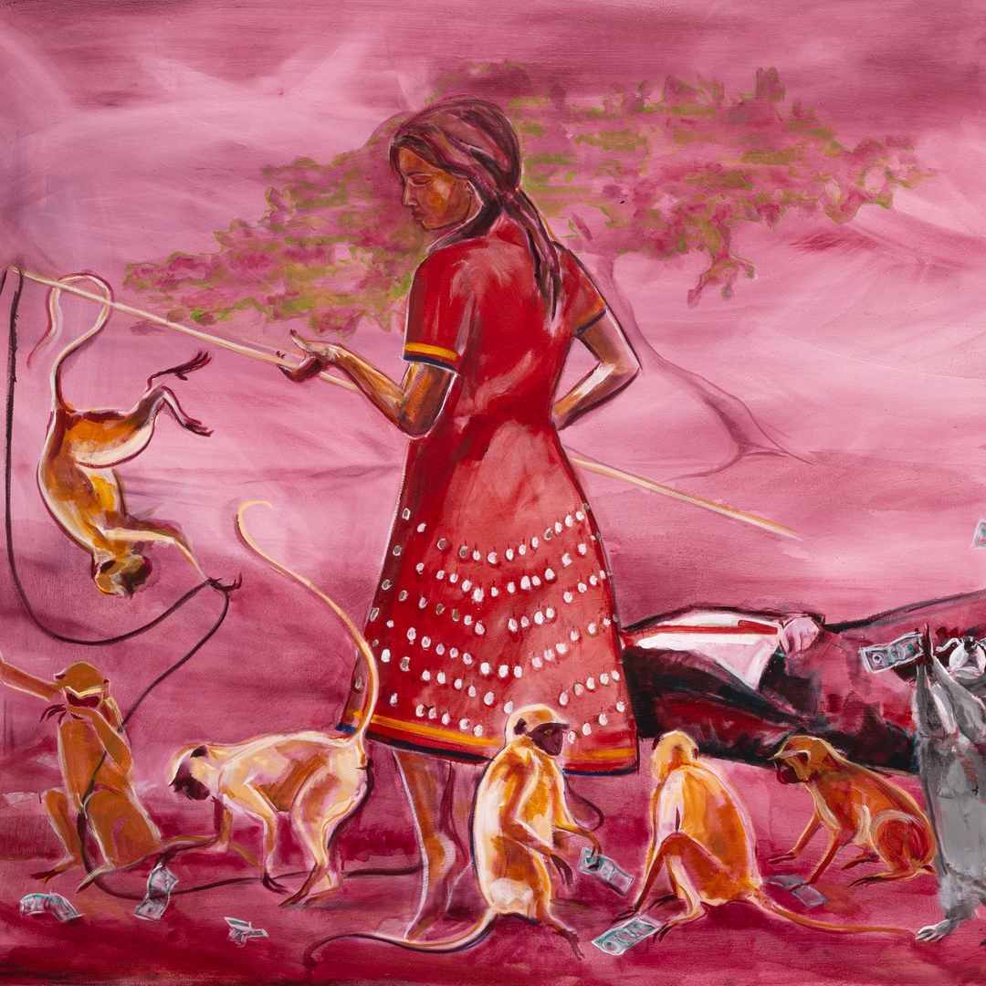 Julie Buffalohead. She who strews the ground with a long line of slain men, 2025 (detail). Oil on canvas. 46 x 84 in.