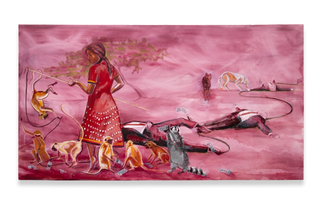 Julie Buffalohead. She who strews the ground with a long line of slain men, 2025. Oil on canvas. 46 x 84 in.
