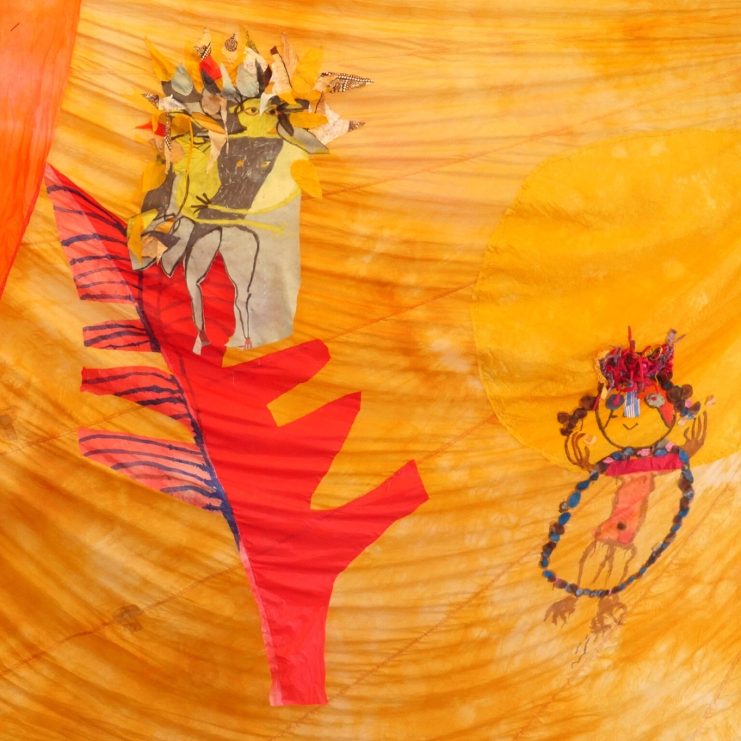 Tamar Ettun. Yellow Wave Cave, 2023. Hand-dyed and stitched boat sails, with acrylic paint, rope, printed silk, hand dyed silk with walnut, hibiscus and onion skins, religious headcovers, infant blanket. 115 x 186 in.