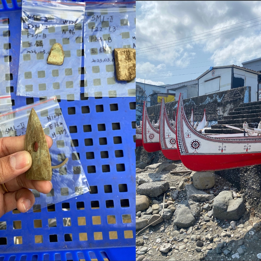 Documentary photographs by Pio Abad (2023). Left: Jade artefacts excavated in Hualien; Right: Tatala boats of the Tao (Yami) people, Lanyu Island.