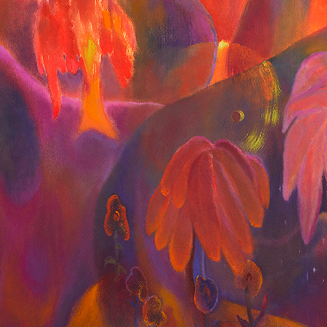 An unknowing plant blooms, singing, 2024(detail) by Sarah Thibault. Oil on canvas, in artist's frame. 60 x 72 in.