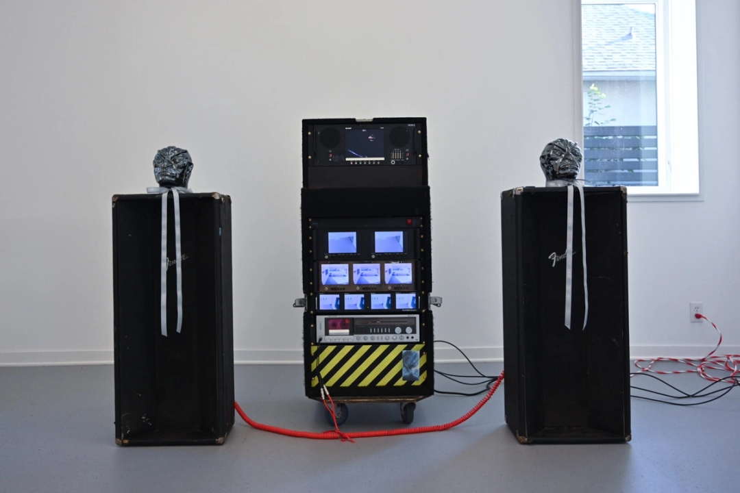 Lee Noble. Sentinel, 2023. LCD rack-mount monitors, Realistic SRC-2500 AM/FM Stereo Cassette Receiver, hardware, flashe, collage, black walnut, vinegar, iron, media player, cables, Fender quad cabinets, Sony CCTV cameras, CRT monitor, stand, video loop, rack unit, casters, sandbag, cemetery dirt, ceramic, glaze, custom ribbon. Dimensions variable.