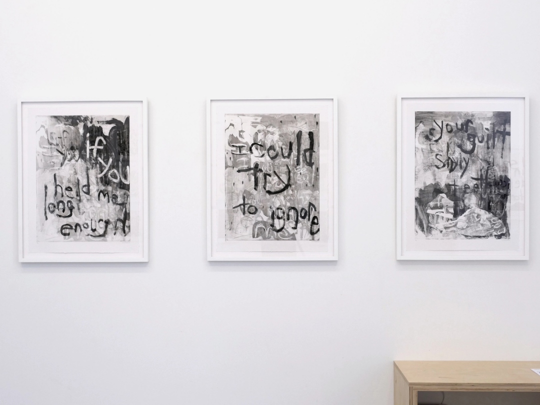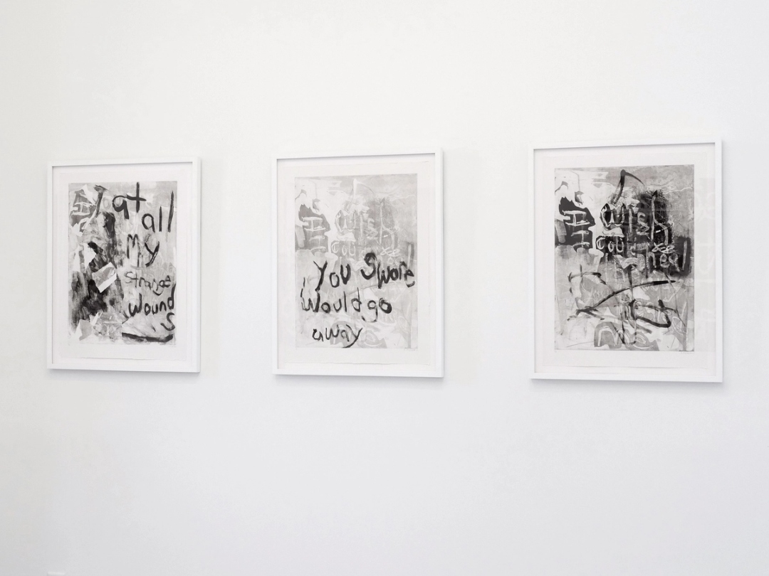 Installation view of A feather plucked from its bird showing Promise Your Children Everything I-III.