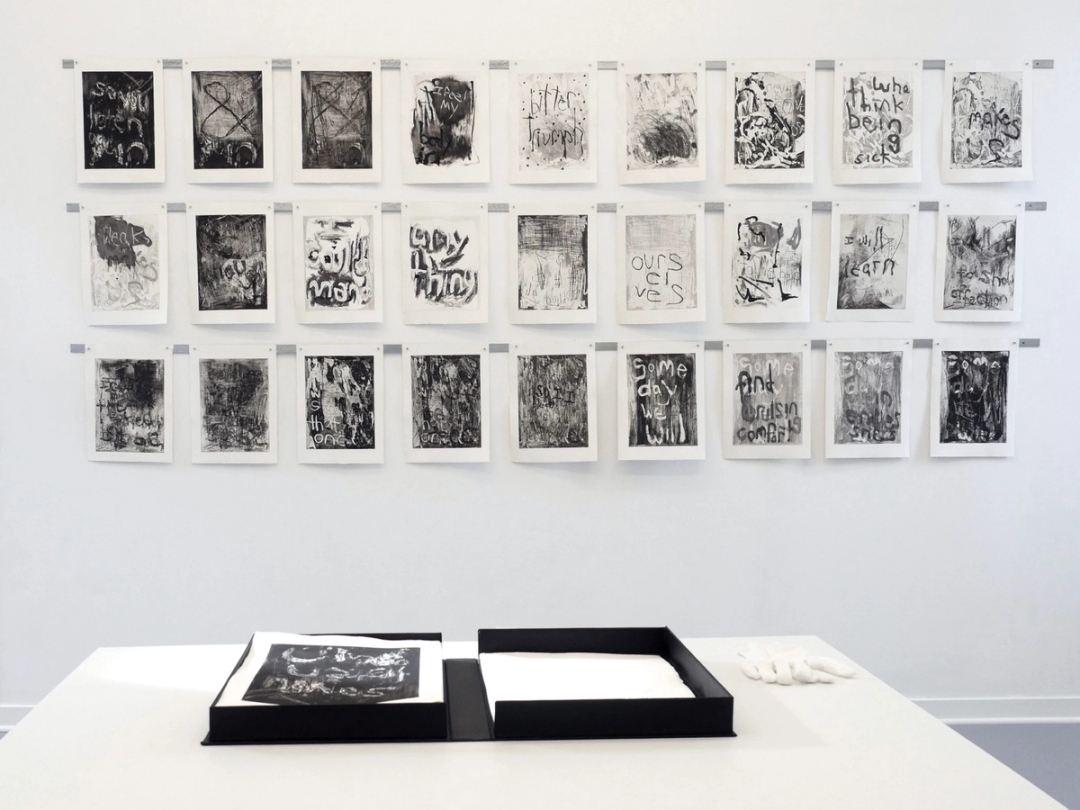 Installation view of A feather plucked from its bird showing the eponymous artist’s book by Benjamin Merritt (sold as a complete unbound collection in handmade box with a limited number of editions also available to purchase individually).