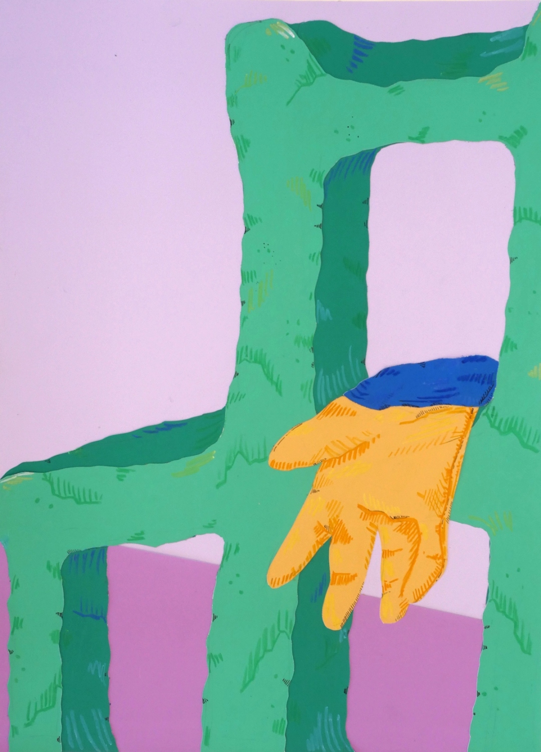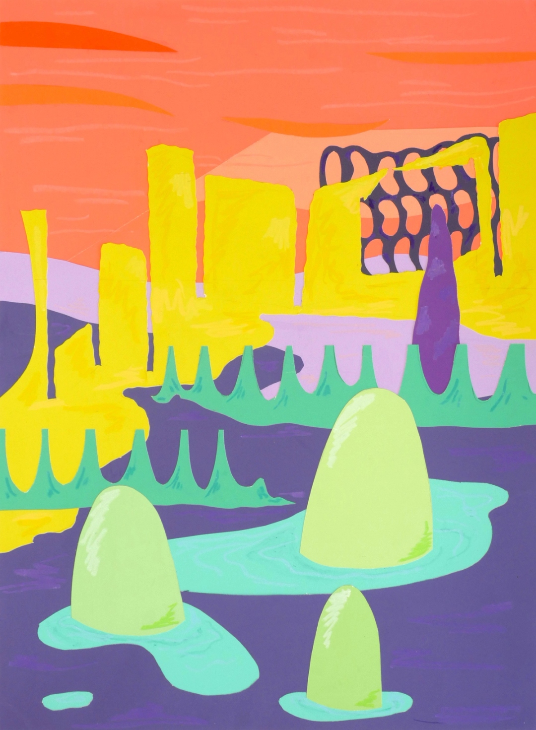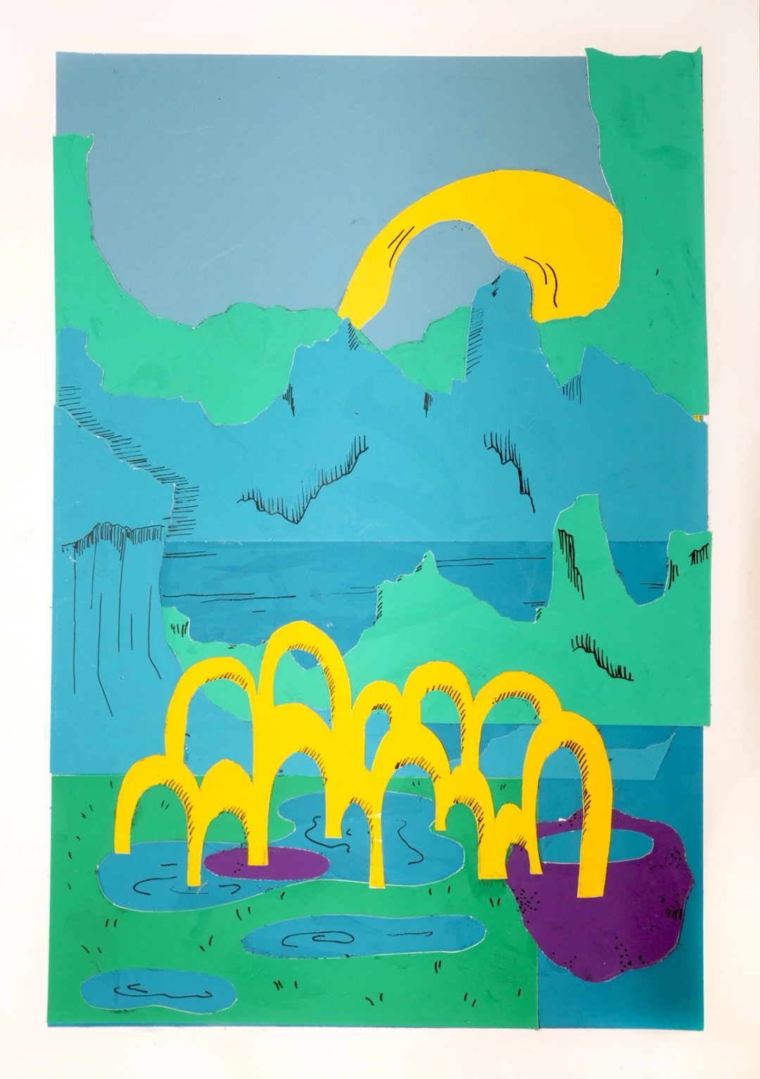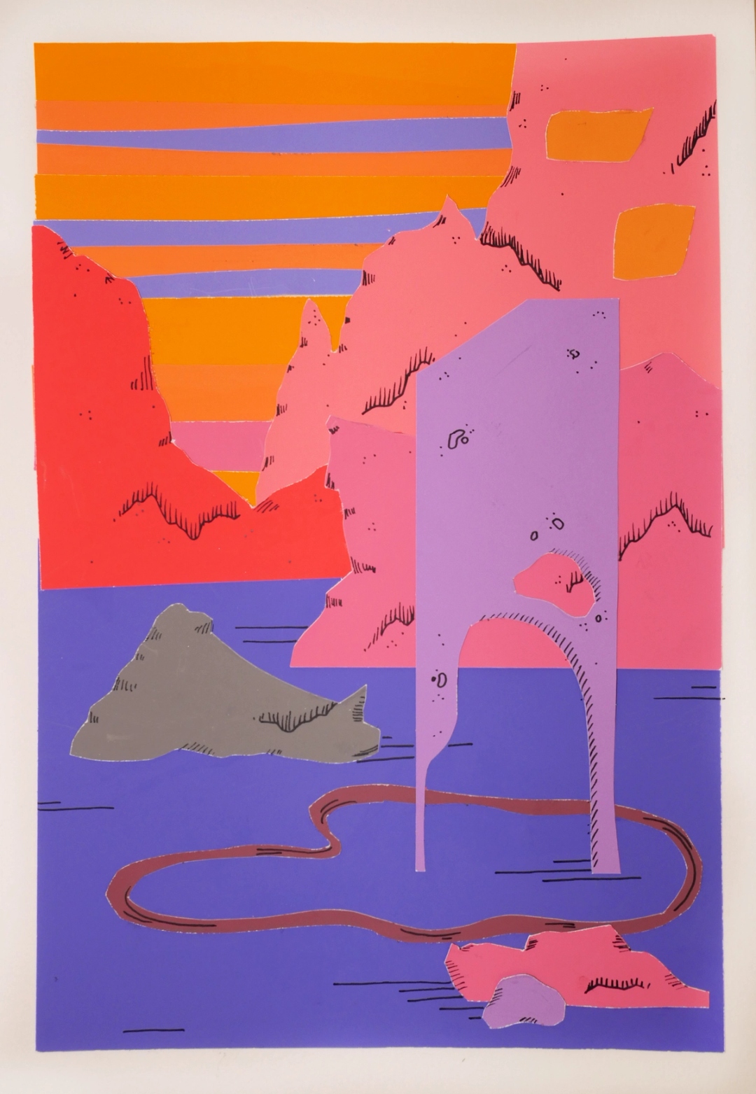 Ink on hand-cut Color-aid paper mounted in custom frame.