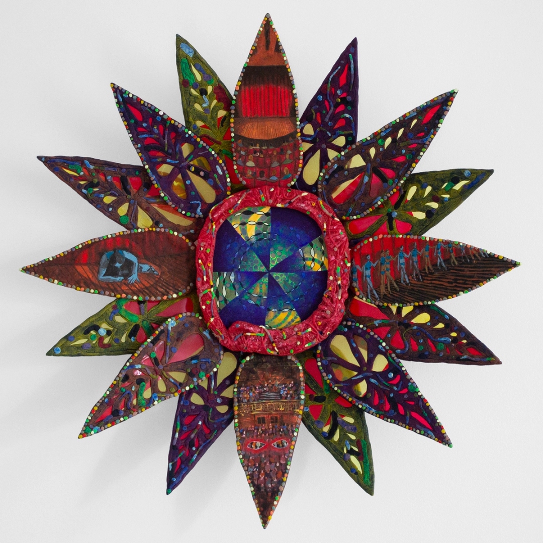 Oakley Tapola. Alrisha, 2025. Gouache and wax medium on epoxy clay, wire, fake pearls, nylon fabric and polyurethane. 14½ x 11¾ in.