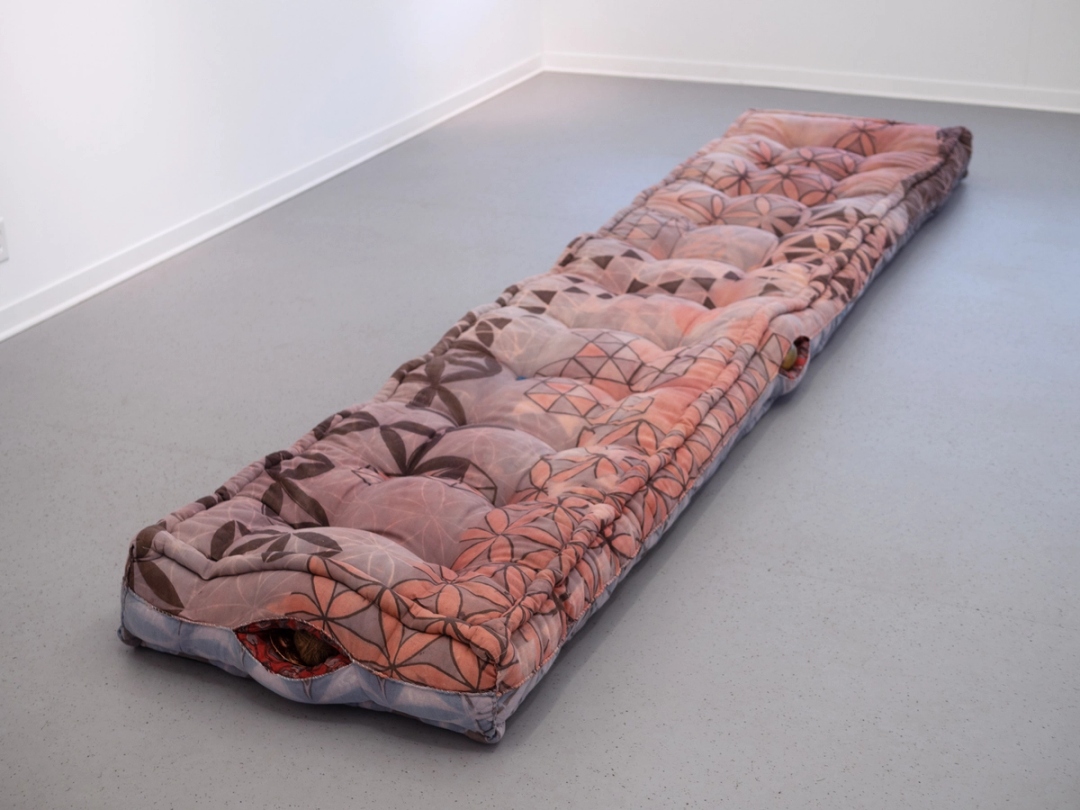 mattress through memory, adaptation and collaboration. The stuffing was made by scouring and carding raw wool and the fabric was painted through a complex resist-dyeing process called Arjakh that the artist learned in India. The imagery references The Flower of Life, a sacred geometry symbol related to the idea of universal consciousness and holding meaning about fundamental patterns and unity in the cosmos. The work contains hidden pockets in reference to the survival strategy of concealing money and valuables during the Holocaust and other historical pogroms.
