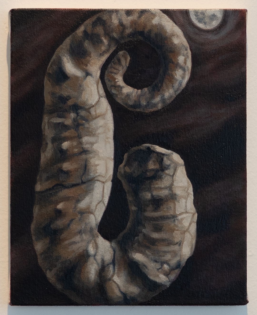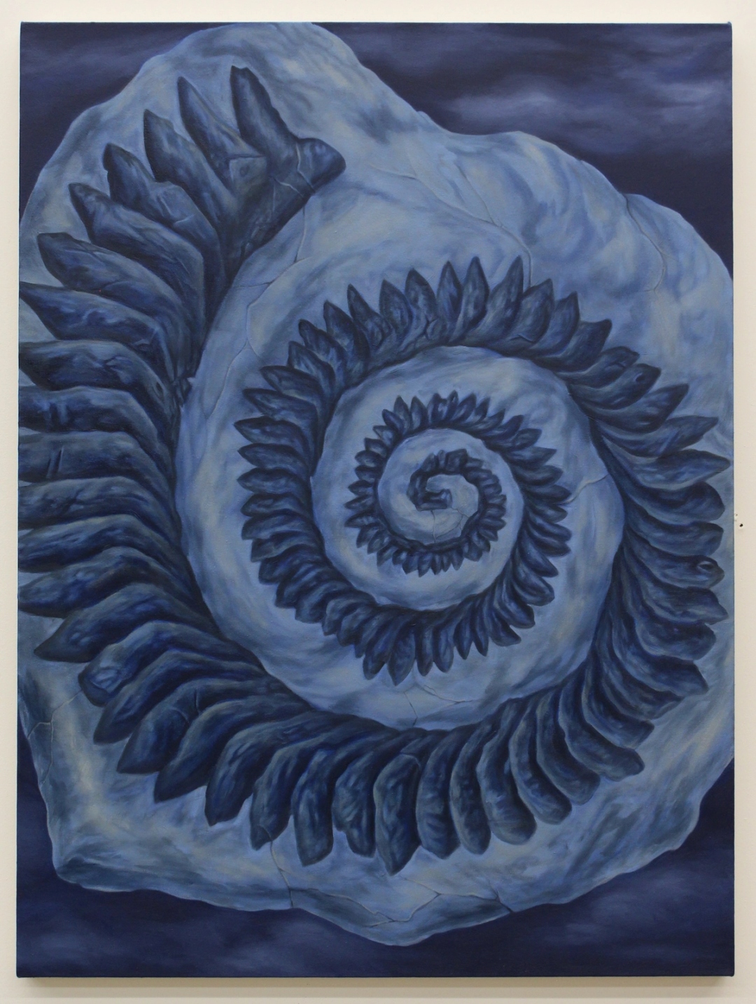 In paintings depicting marine fossils, Kristen Sanders excavates meaning from vestiges of ancient life. In Deep Reflex (2026), an ammonite from the early Cretaceous lies under a full moon. For Sanders, the way the mollusk curls in on