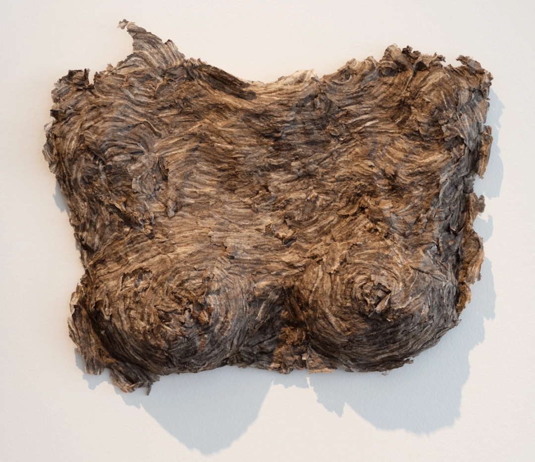 Tamara Aupaumut. Reconstructed Home, 2023. Papier-mâché and wasp nest. 15 x 20 x 4 in.