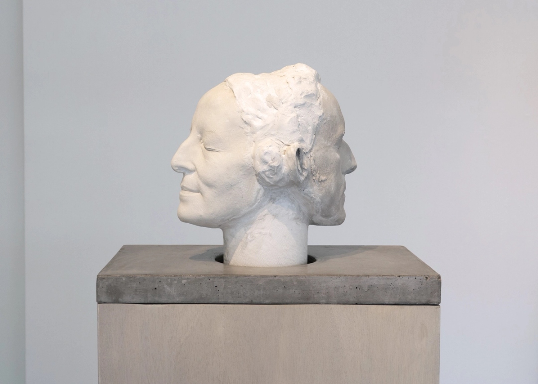Alexa Horochowski. The Revolving Janus, 2026 [detail]. Gypsum, concrete, plywood, motorized turntable. 61⅛ x 18¼ x 11¼ in.