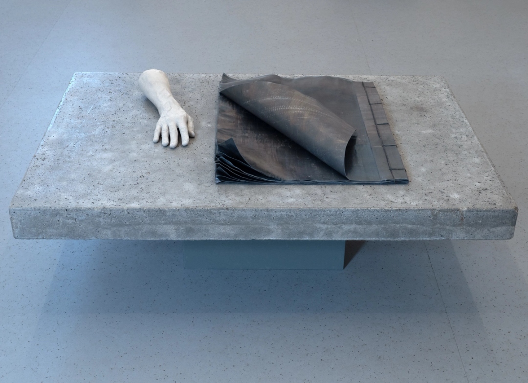 Alexa Horochowski’s two new sculptures draw on research into mourning rituals, grief, memory, mythology and the language of dreams. In The Revolving Janus (2026), the titular ancient Roman god is rendered as a double-sided head with both masculine and feminine visages, continuously rotating on a motorized turntable. Associated with beginnings, thresholds and passages, Horochowski’s continuously rotating rendition of Janus exudes a zen equilibrium that projects strength in the face of uncertainty. The work embodies the wheel of history, suggesting that time is not linear but recursive, folding past, present and future into a single psychic field. In The Somnambulant’s Ledger (2026), an oversized book constructed in lead sits on a concrete slab next to a resting arm embedded with a crystalline geode. Adapted from a childhood dream wherein the pages of a book flipped on their own accord, the ledger bears a funerary weight conjuring both archival record and inexorable passage.