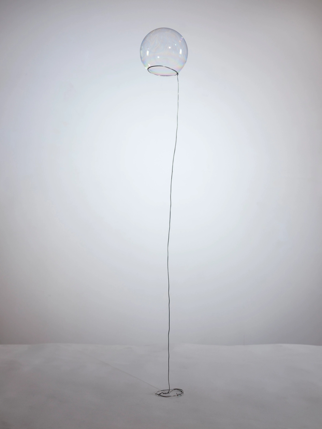 In two new photographs by David Goldes, the artist depicts fleeting, tenuous moments in staged compositions. Through a deliberately illusionistic mise-en-scène, the artist’s images – physically constructed in his laboratory-like studio in Northeast Minneapolis and then captured on camera – document temporary installations of a soap bubble held by a wire armature and a group of stones tethered by vibrating strings. Though meticulously staged, these structures evoke monuments to precarity, balancing material fragility with an almost supernatural tension. Goldes’ images act as quiet reminders of instability — physical, political and existential — and of the invisible forces that briefly hold matter in suspension.