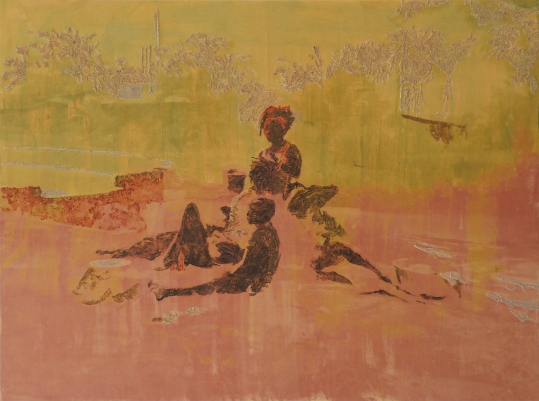 Swamp, Dovalema, Well, Uncle Dauda’s farm, Baoma, Dɔmagbiami, and acrylic on cotton. 66 x 44 in.