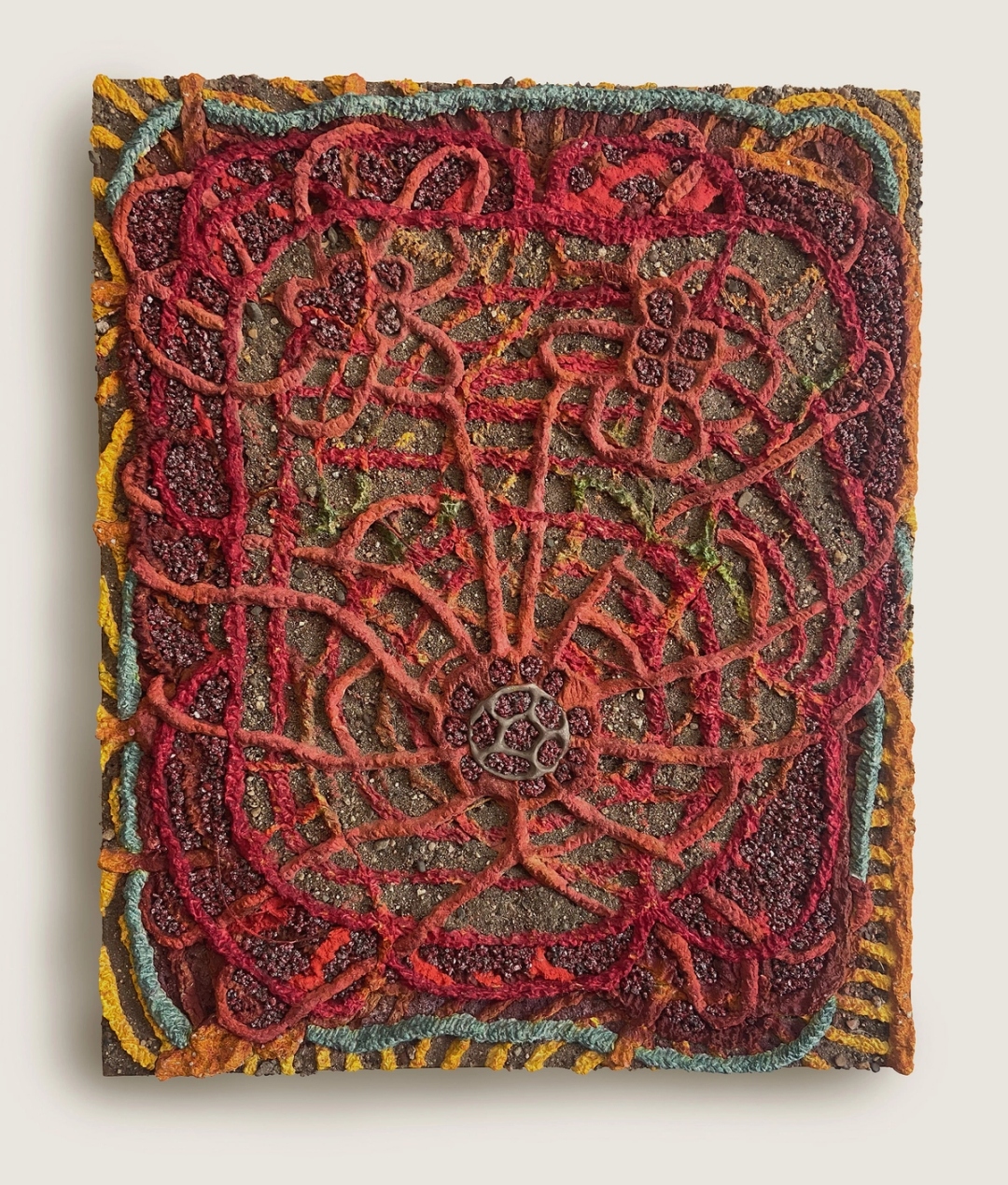 Paper pulp, aquarium gravel, sand, air fire clay, string, beads, resin and procion dye on board