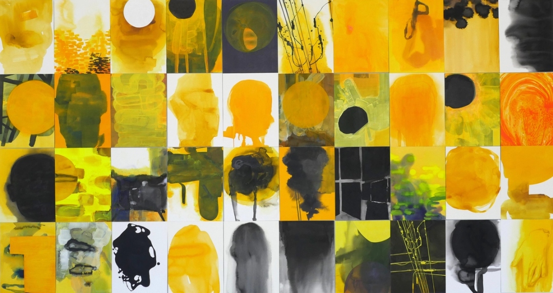 Shana Kaplow. Spectulatively Into The Sun, 2021. Ink and acrylic on paper mounted on Dibond (in 40 parts). 46.5 x 87.5 inches. $8500.
