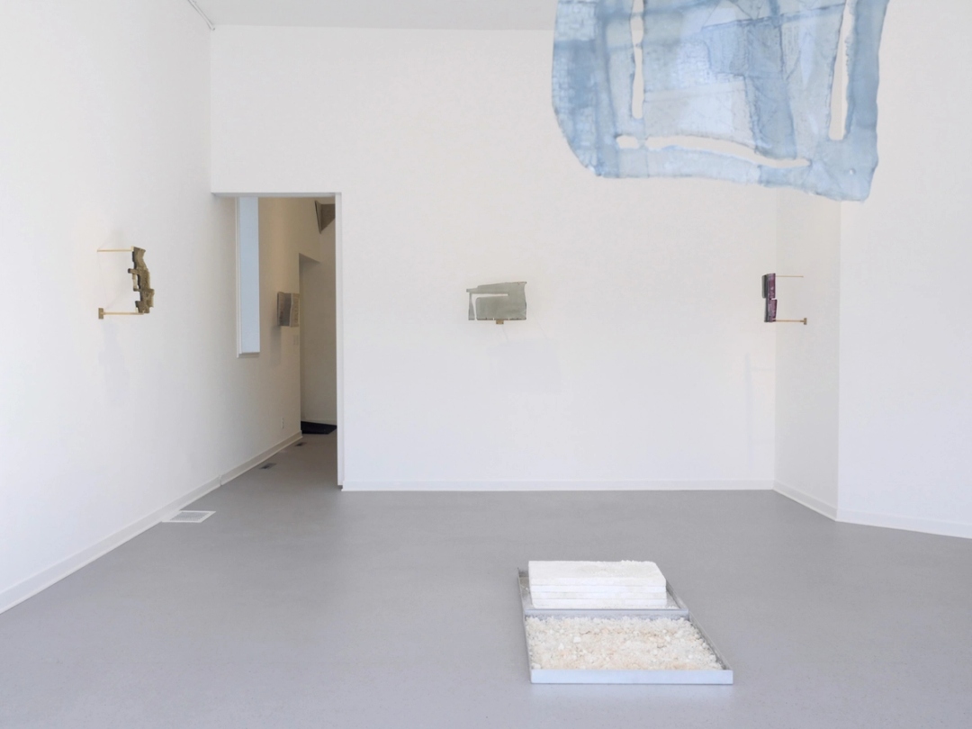 Evaporated Hours, SaraNoa Mark’s (b. 1991, New York) debut solo exhibition with the gallery, adopts its title from the artist’s process of desalinating seawater by collecting buckets from the Atlantic Ocean and boiling off the water until only salt remains. Paired with limestone slabs watered daily with an erosive vinegar solution, and presented in aluminum basins, the eponymous work (Evaporated Hours) is a paradigmatic example of the artist’s twin preoccupations: the creation of meaning through the enactment of ritual, and the physical transformation of material and land by the passage of time.
