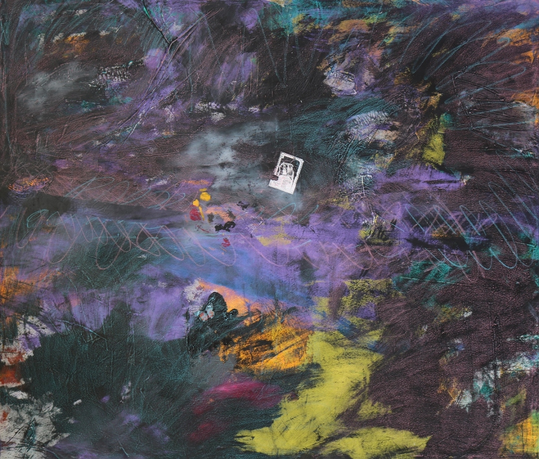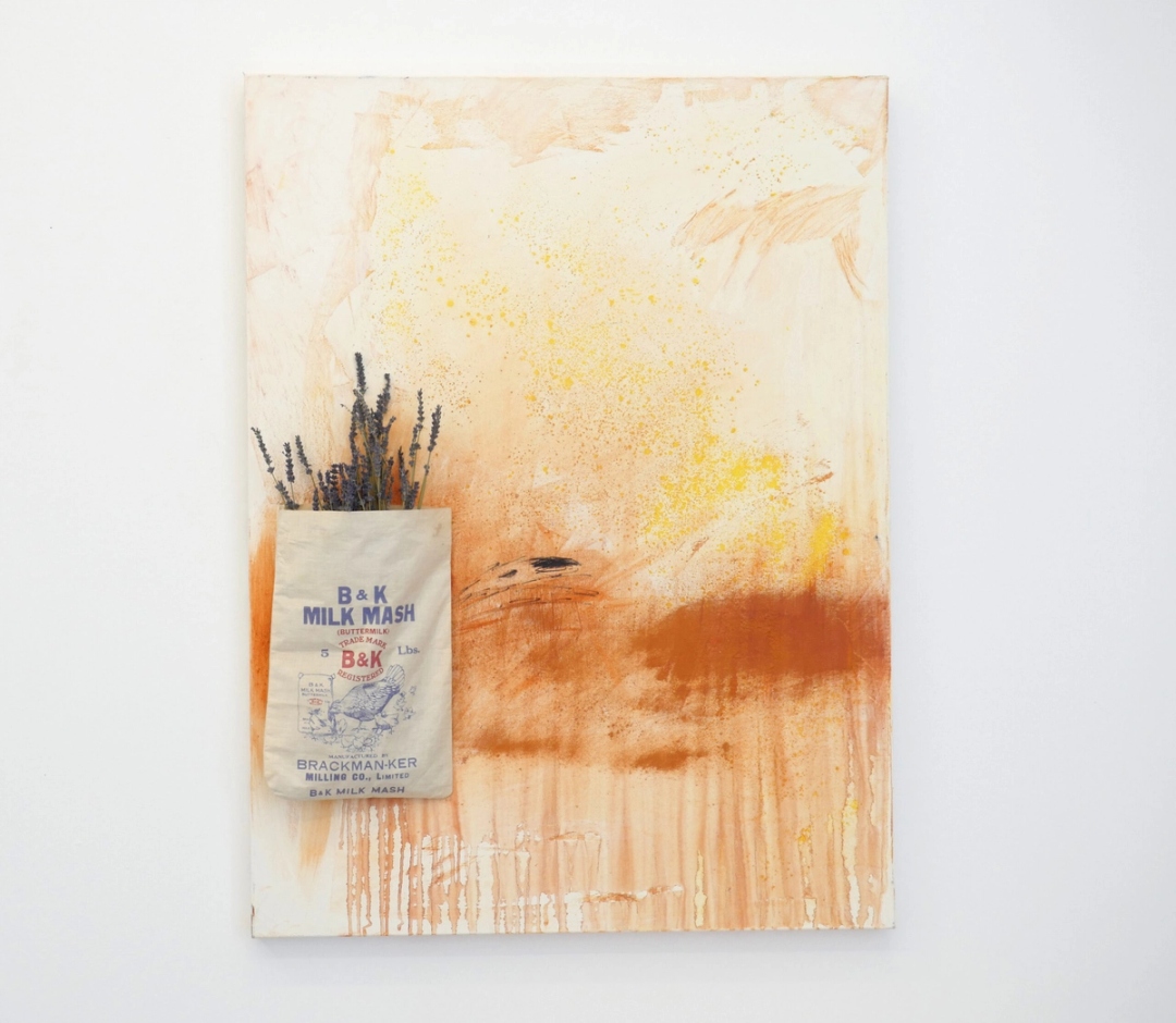 Oil ground, pigment, dried lavender in antique feed sack on on canvas