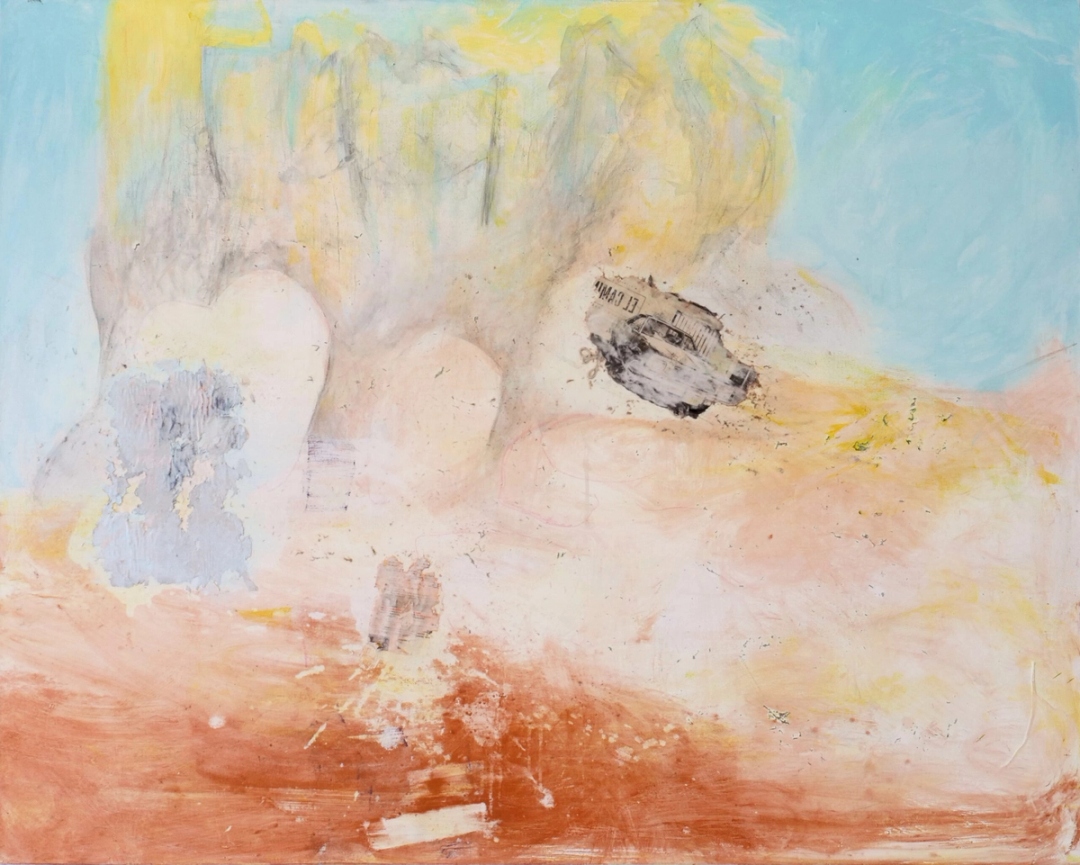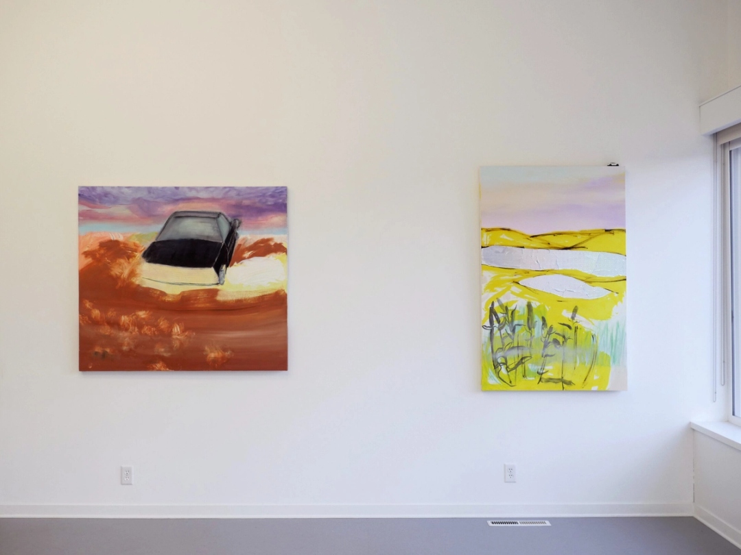 In Strange Vista, Mary Celeste Griffin (b. 1986, Flagstaff, AZ) traces personal and environmental narratives across the vast landscape of the American Southwest. In layering together different temporalities into strange vistas and landscapes, Griffin employs a materially peripatetic approach to image-making, constructing her paintings and works on paper from oil, acrylic, charcoal, and spray paint, while also including garments saved from the decade she spent thrifting clothes, antique feedbags passed down from her grandmother, ephemera from art exhibitions and punk shows in Arizona, and holographic wrapping paper. By using innovative approaches to image-making to both materialize the landscapes of her youth and metaphorically imbue them with redolent personal memories, Griffin creates a poignant body of work that, instead of viewing landscape as a mere snapshot of a notable place, reveres it as a deeply inscribed and fragile container of countless sacred lives.