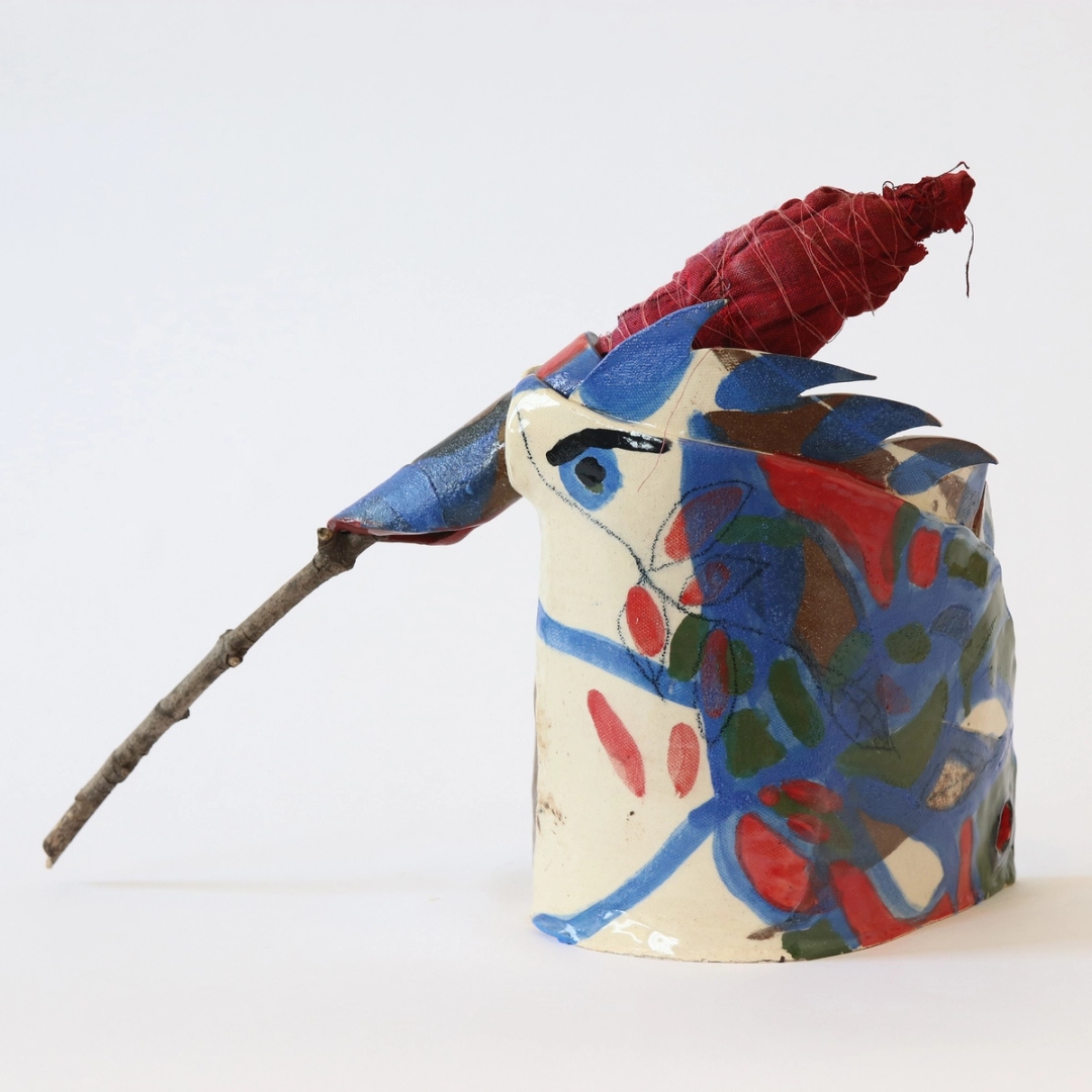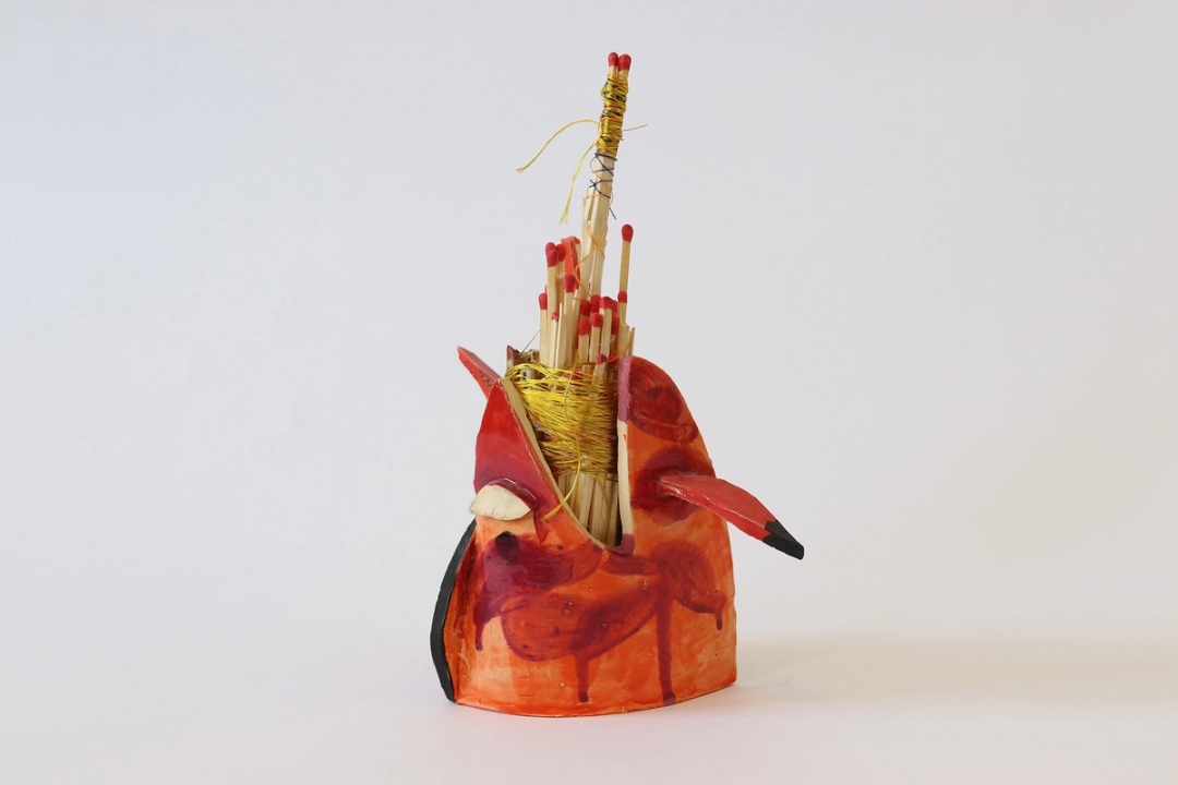Ceramic, glaze and underglaze, long branch matches, silk thread