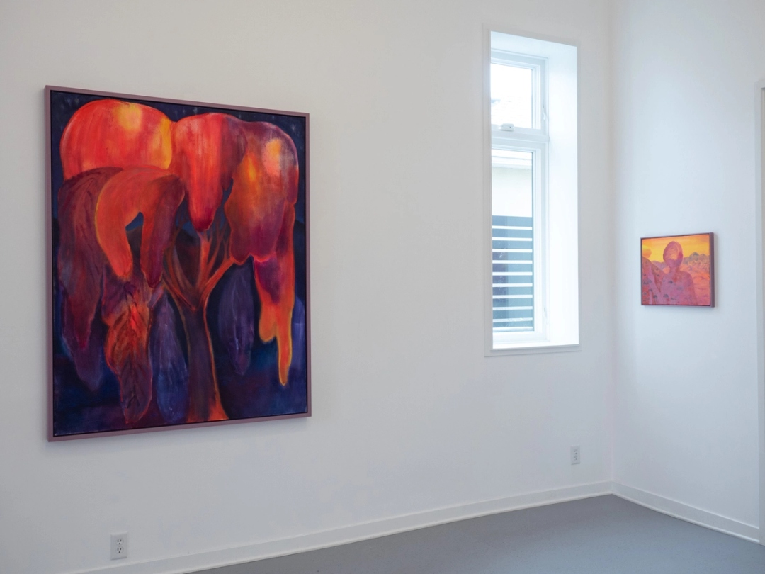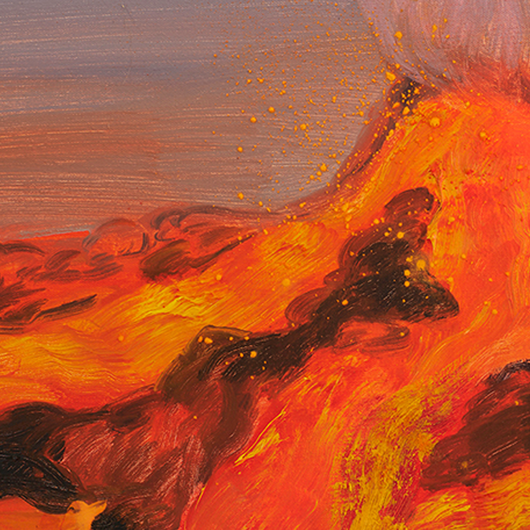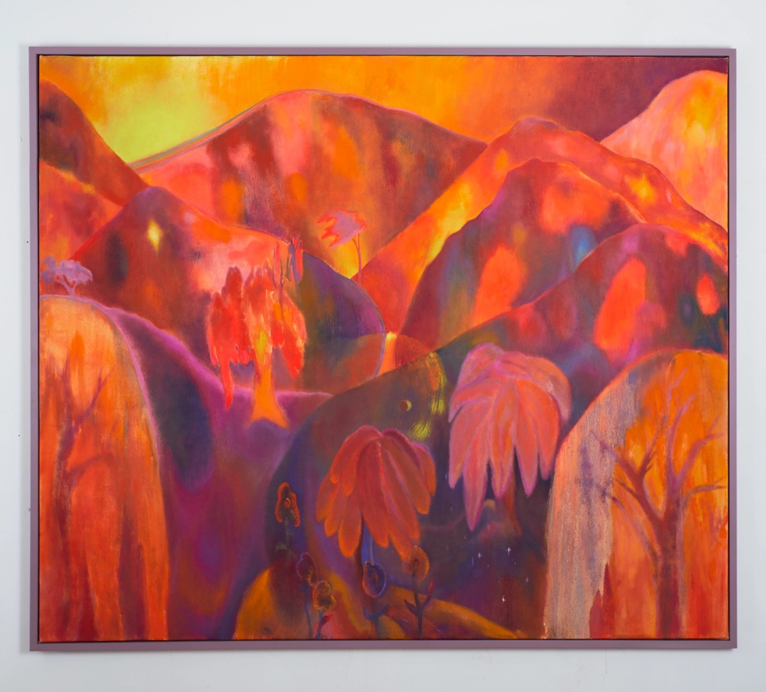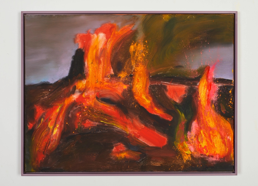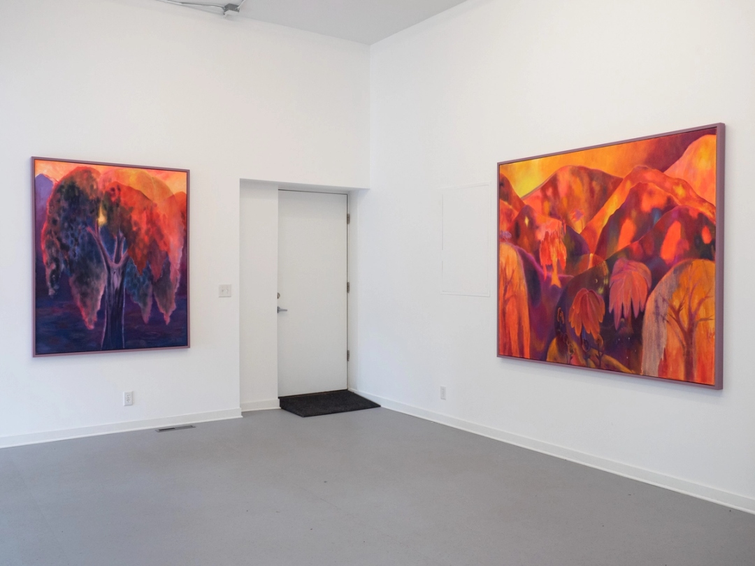In Things Worth Saving, Dreamsong’s second solo exhibition with Sarah Thibault (b. 1980, Minneapolis), the artist presents a series of vivid new landscape paintings. In luminous palettes of feverish orange, humid pinks and blues, and neon purple, they depict trees, mountains, and volcanoes as embodiments of a vast range of human emotion and spirituality. Licked by fire and imbued with tenderness, Thibault’s landscapes highlight both nature’s precarity and its unique capacity to heal.