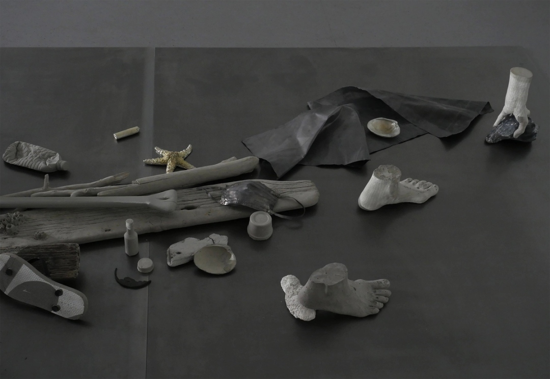 Alexa Horochowski. Wrack Line, 2024 (detail). Concrete, steel, lead, pewter, gypsum, tar, aluminium, iron, rope, rubber, wood, audio, single channel video installation projected directly over two exhibition walls, stereo audio track.