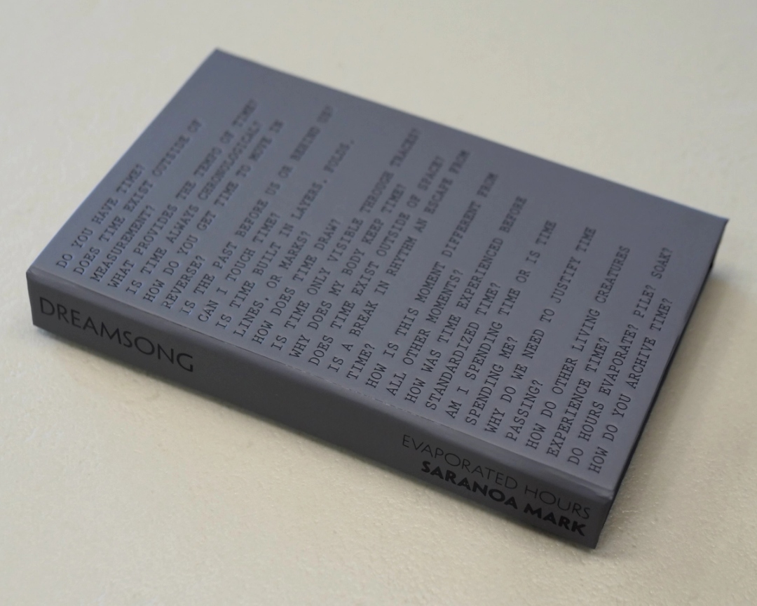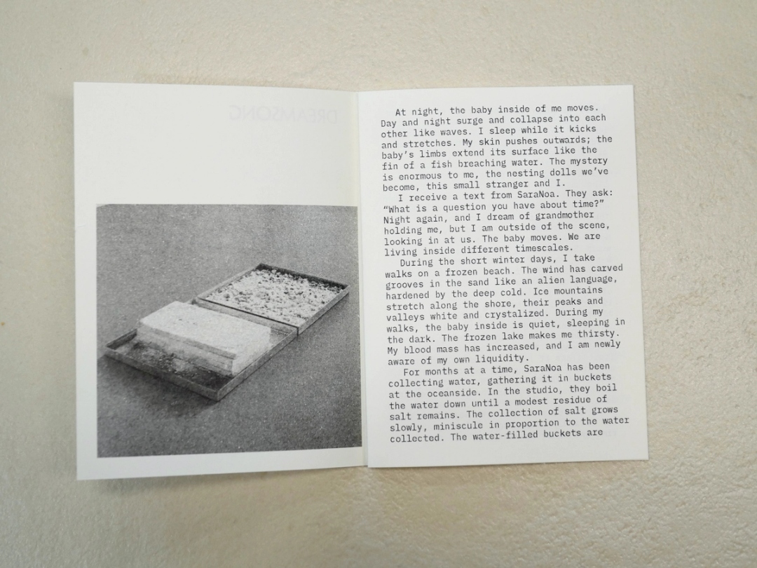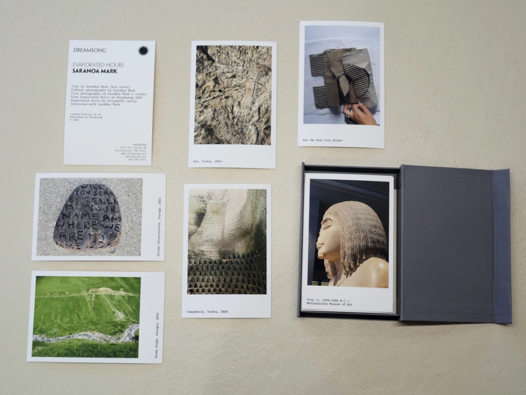 An unbound publication presented in a custom box debossed with text by SaraNoa Mark, including 15 original photographs by SaraNoa Mark printed on Hahnemühle Photo Rag Paper as well as 5 photographs documenting the installation of their eponymous exhibition at Dreamsong, March 22 - May 3, 2025. The box also includes two risograph-printed booklets featuring an essay by Elizabeth Lalley and an interview with the artist. Printed in a limited edition of 50.